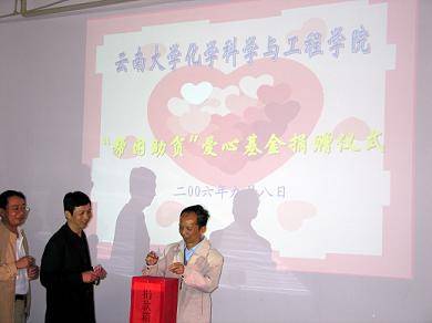 刚刚迎来2006级的新同学。又迎来第22个教师节。在这双喜临门的日子,化学科学与工程学院工会、关工委向全体教职员工发出为学院“帮困助学”爱心基金捐款的倡议,得到全院教职工的积极响应。9月9日下午学院举行了隆重的捐款仪式。学院党政领导、陈景院士、各系领导、学院各办公室主任、院团委书记、院工会主席率先在仪式上捐款,短短半个小时,捐款就达3650元。目前,捐款仍在踊跃继续。 本次捐款活动在学院广大教师中引起了极大的反响,教师们纷纷表示为了帮助贫困生完成学业,愿献出自己的一份爱心。