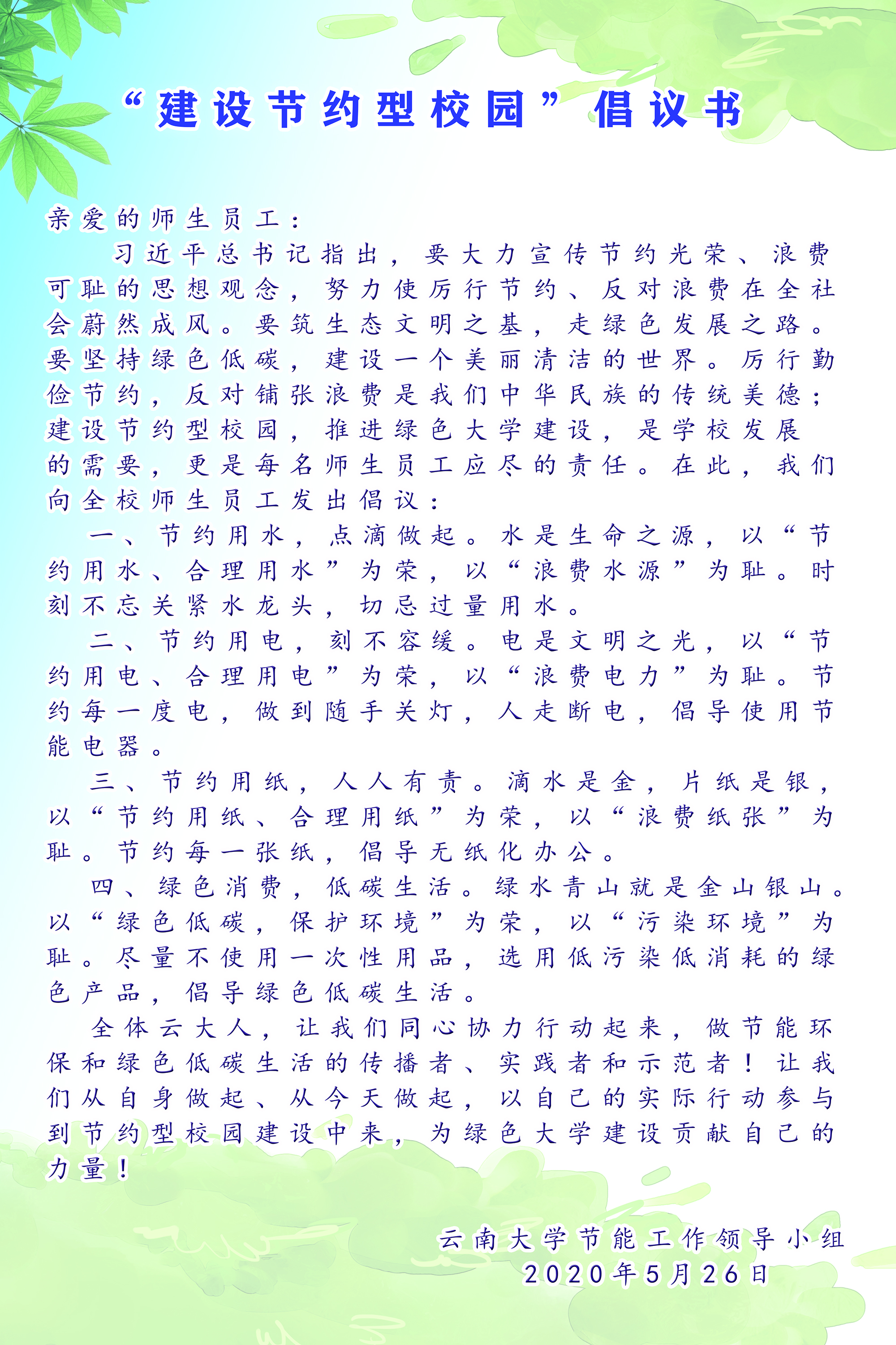建设节约型校园倡议书