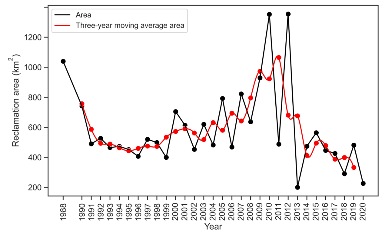 团队在中国四大河口滨海湿地结构的快速变化研究中取得的进展,其研究成果也于2023118日以“Rapid and large changes of coastal wetland structure in Chinas major river deltas”为题发表在国际生态学著名期刊Global Change Biology上。研究以中国四大河口三角洲(辽河口、黄河口、长江口和珠江口)为主要研究区域,基于19842020年逐年滨海湿地数据集(图4),比较了不同河口滨海湿地面积、斑块大小及数量的时空动态,探讨了人类围垦、河流输沙量、植物入侵等对其的相对影响,分析了四大河口国家级保护区的保护成效。