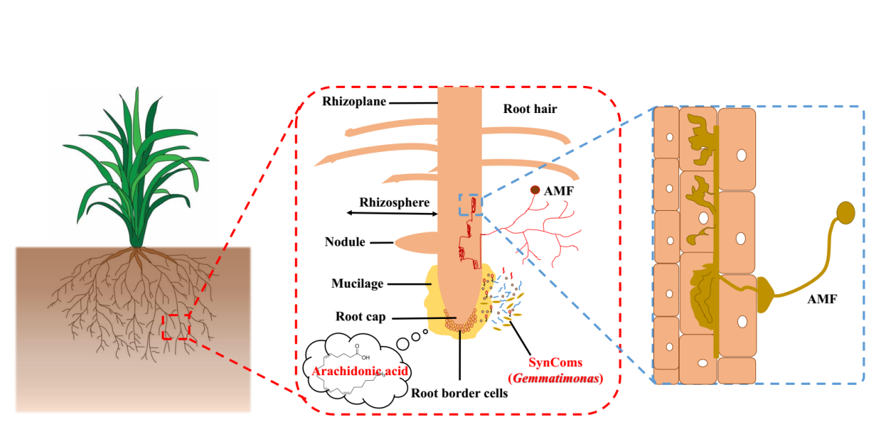 此外,近年对几种AM真菌菌株进行的全基因组测序的研究表明,与腐生真菌或外生菌根真菌的基因组相比,AM真菌具有很少的外酶谱,对土壤有机养分的直接活化能力相对较弱。因此,AM真菌共生相关的根际微生物是影响菌根途径养分吸收效率的关键因素。然而,在高度复杂的植物根系-根际微生物-土壤互作关系中,许多问题仍不清楚。研究组以三种AM真菌和牧草植物百脉根为研究对象,设置3个控制实验:首先利用原生土壤和灭菌土壤对比研究,从生物量、植物养分、酶活、功能基因定量等角度探究了AM真菌与细菌在根际的相互作用;然后利用菌根共生突变体验证了AM真菌-细菌之间的相互作用;通过第三个培养实验,即在植物根际添加合成微生物组和AM真菌来验证其作用机制,结合16S扩增子和宏基因组测序,开展根际细菌分离和功能鉴定试验,对AM真菌共生介导下的根际细菌的组成和功能进行解析。同时,利用植物根部代谢组、土壤代谢组和植物根部转录组多组学联合分析对AM真菌共生体的根系化感物质进行解析,发现菌根共生刺激根分泌化感物质,如花生四烯酸,为宿主根际招募有益的微生物群来促进植物生长。