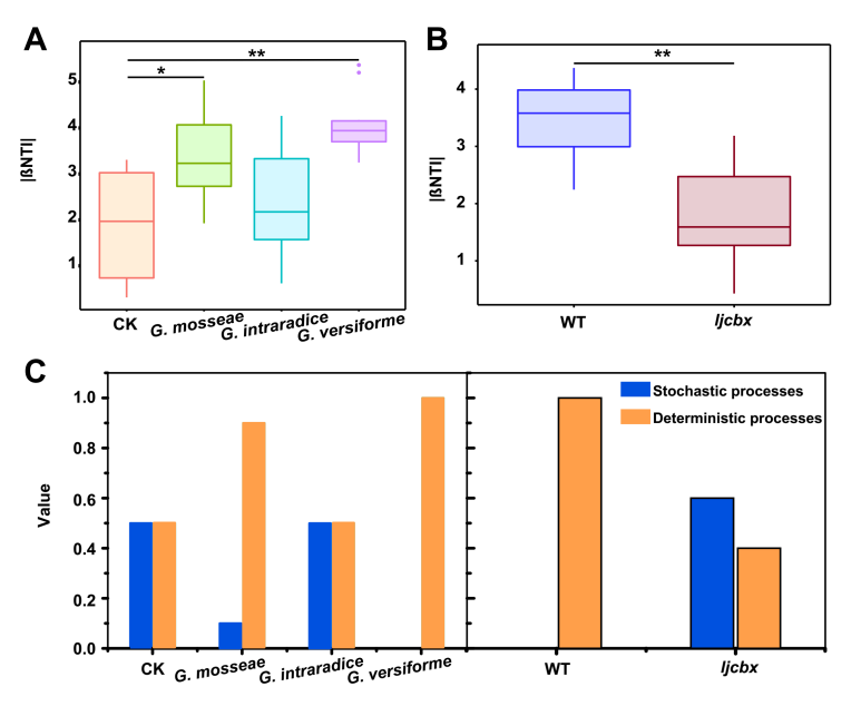 丛枝菌根(AM,Arbuscular mycorrhiza)真菌是在陆地生态系统中广泛存在的一类土壤微生物,它们可以与大多数陆地上的植物形成互惠共生关系,促进宿主对氮、磷、钾等养分的吸收。目前大多数研究集中在AM真菌对细菌多样性和群落组成的影响,而细菌群落组装过程及细菌的功能研究还不清楚。课题组以三种AM真菌和牧草百脉根为研究对象,利用16S扩增子和宏基因组对根际细菌进行测序,并结合根际细菌的分离和功能鉴定,研究丛枝菌根改变根际细菌群落结构以促进土壤养分周转的机制。结果表明,接种丛枝菌根真菌后,根际细菌的种间多样性发生了显著变化,网络节点增加,网络模块聚集减少,植物与AM真菌互作驱动了根际中群落构建的确定性过程。同时,根际富集了氮循环和磷利用功能细菌,并且分离到的根际细菌大部分具有土壤养分周转的能力。表明AM真菌可以调节根际细菌群落的聚集,并吸引特定的根际细菌,以促进南方草地土壤养分周转。
