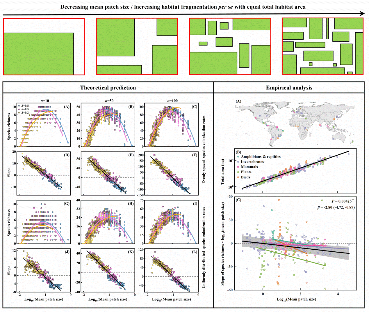 最后,通过整合分析全球破碎化集合群落生物多样性野外观测数据发现,随着平均斑块大小的增加,生物多样性与平均斑块大小简单线性关系的斜率总体上由正逐渐转为负,与理论预测结果相符。因此,该研究为当前关于生物多样性-生境破碎化关系的激烈争议提供了全新的调解方案,对生物多样性保护与管理具有重要的启示。