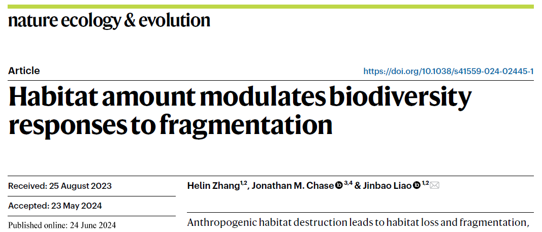 近日,我院廖金宝课题组在Nature Ecology & Evolution期刊上发表了题为“Habitat amount modulates biodiversity responses to fragmentation”的研究论文(https://www.nature.com/articles/s41559-024-02445-1)。该研究发现生境损失严格调控并诱导了生物多样性对生境破碎化的单峰响应,可为生物多样性保护与管理提供全新的理论视角与决策支持,具有极其重要的保护生物学意义。