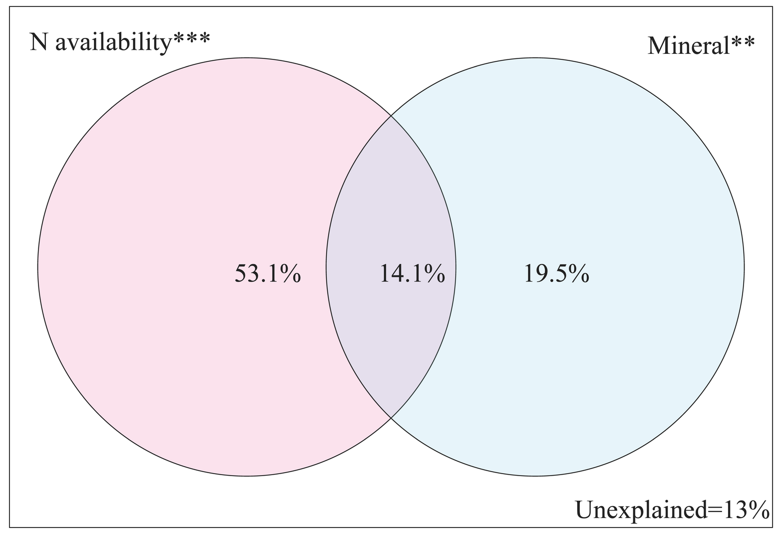 氮有效性能显著增加陆地土壤有机碳库,然而其潜在的机制还存在争议。本文从新形成的碳和微生物残体的角度出发,研究了西南高寒地区不同森林类型氮添加对新碳稳定的影响以及新微生物残体对稳定碳库的贡献。团队以玉龙雪山两种不同类型森林类型土壤为研究对象,通过添加标记的葡萄糖和氮,进行为期60天的培养实验,旨在揭示了新碳的固持和新微生物残体对稳定碳库的贡献。结果发现来源于葡萄糖的新碳更多的分布在矿质颗粒组分中,表明新碳主要受到矿质颗粒的保护。同时氮添加降低了新碳在该组分中的分布。相反,氮添加却显著增加了新合成的微生物残体的量,其中更多的真菌残体与矿质颗粒结合。在阔叶林土壤中我们发现新合成的真菌和细菌残体比低于针叶林土壤,这主要与阔叶林土壤具有较高的矿质颗粒组分有关。总的来说我们的结果揭示了氮有效性和矿质颗粒组分在决定真菌残体对土壤稳定碳库的贡献中的作用,为准确评估土壤碳稳定性提供新的视角。