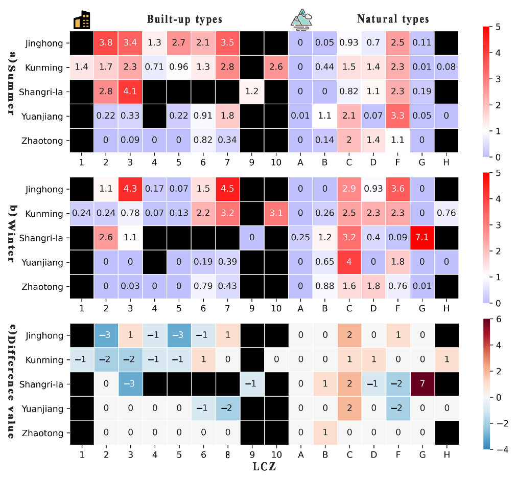 图2不同气候背景城市冬季和夏季LCZ热贡献度
