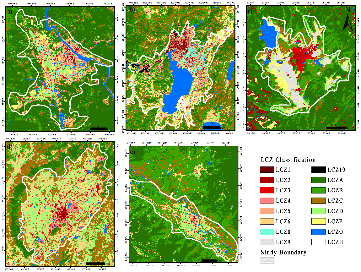 图1不同气候背景城市LCZ制图(a.景洪;b.昆明;c.香格里拉;d.昭通;e.元江)