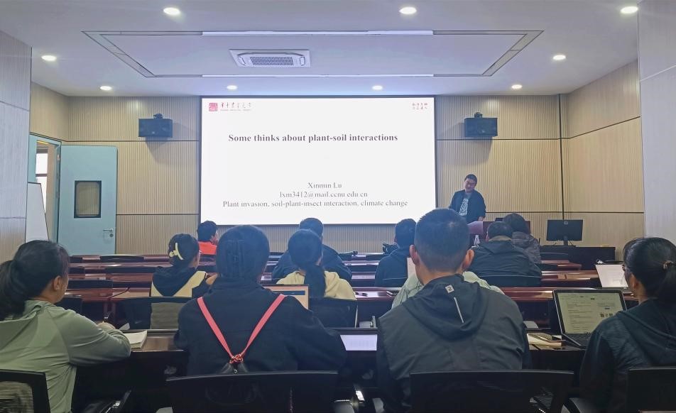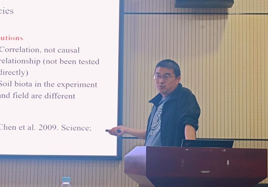 卢新民教授以“Some thinks about plant-soil interactions”为题,针对植物-土壤反馈相互作用实验的局限性,强调将植物-植物相互作用纳入植物-土壤反馈框架。然后探讨了植物-土壤反馈的时间动态,及其在群落水平上与植物丰度的关系,为大家未来的研究工作提供了有力的参考。会后,卢新民教授与参会人员围绕相关问题进行了深入讨论与交流。